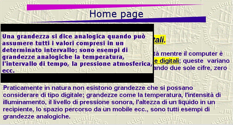 Grandezze analogiche e grandezze digitali.è noto che le grandezze reali variano con continuità mentre il computer è in grado di eseguire elaborazioni solo su grandezze digitali; queste variano per quantità discrete e sono rappresentabili utilizzando due sole cifre, zero e uno (Bit).Praticamente in natura non esistono grandezze che si possano considerare di tipo digitale; grandezze come la temperatura, l'intensità di illuminamento, il livello di pressione sonora, l'altezza di un liquido in un recipiente, lo spazio percorso da un mobile ecc., sono tutti esempi di grandezze analogiche.